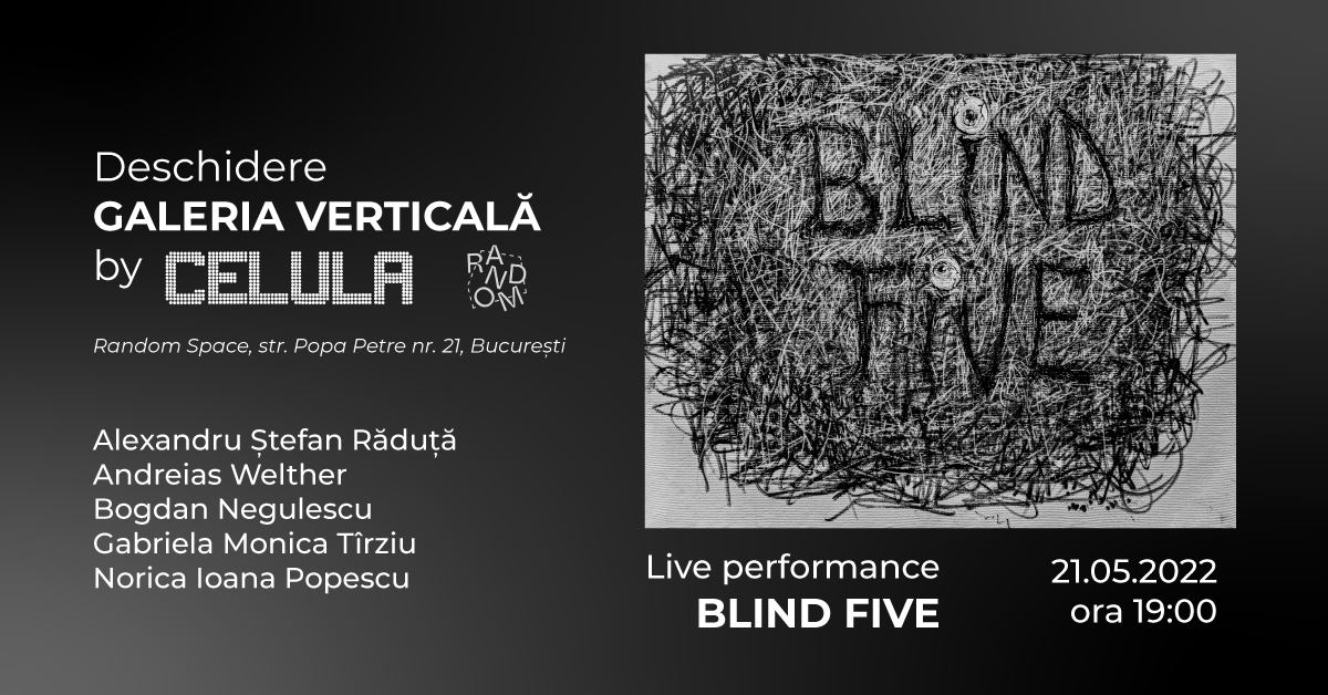 BLIND FIVE reunește cinci dintre artiștii Celulei de Artă: Alexandru Ștefan Răduță, Andreias Welther, Bogdan Negulescu, Gabriela Monica Tîrziu și Norica Ioana Popescu iar conceptul performance-ului își propune, prin negarea vizualului și suprapunerea a 5 limbaje artistice diferite, fără a fi influențate între ele, realizarea unei singure lucrări. Fiecare artist va avea, pe rând, 15 minute în care se va exprima legat la ochi pe o suprafață albă cu o tehnică proprie. Ordinea este aleatorie, prin tragere la sorți, evitând astfel vizualizarea rezultatului precedent, publicul fiind singurul care va vedea toate etapele performance-ului.